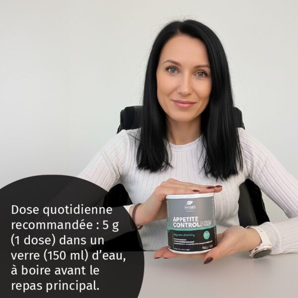 Dose quotidienne recommandée : 5 g (1 dose) dans un verre (150 ml) d’eau, à boire avant le repas principal.