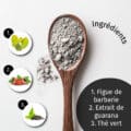 Ingrédients : poudre d’inuline, poudre de tapioca, enveloppe de psyllium (Plantago ovata), extrait de figuier de Barbarie (Opuntia ficus-indica, cladodes)¹, arôme pêche, arôme citron, extrait de thé vert (Camellia sinensis (L.) Kuntze, feuille), extrait de guarana (Paullinia cupana Kunth, graine), stabilisant : cellulose, concentré de betterave rouge (maltodextrine, poudre de betterave rouge (Beta vulgaris)), édulcorant : glycosides de stéviol issus de la stevia. Contient des sucres naturels et de la caféine.