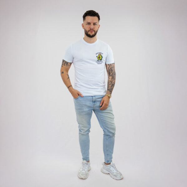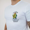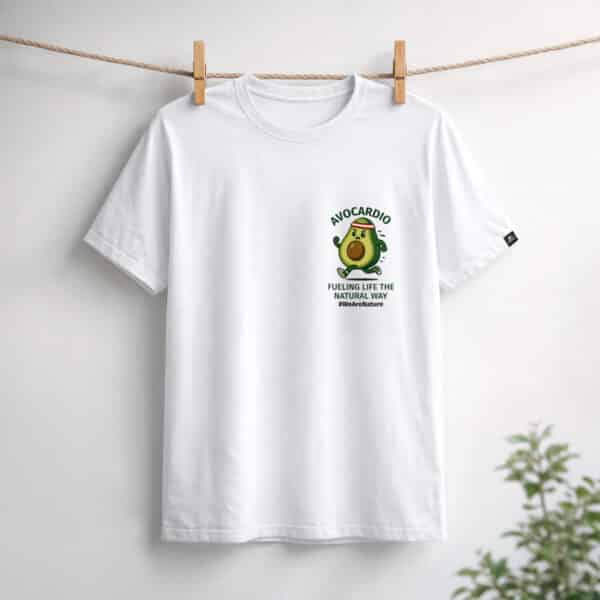 Un T-shirt blanc avec une illustration audacieuse d’un avocat en train de courir et le texte ludique « AVOCARDIO. » Avec le slogan « ALIMENTER LA VIE DE MANIÈRE NATURELLE, » ce tee-shirt est un rappel amusant et motivant pour rester actif et continuer à bouger.