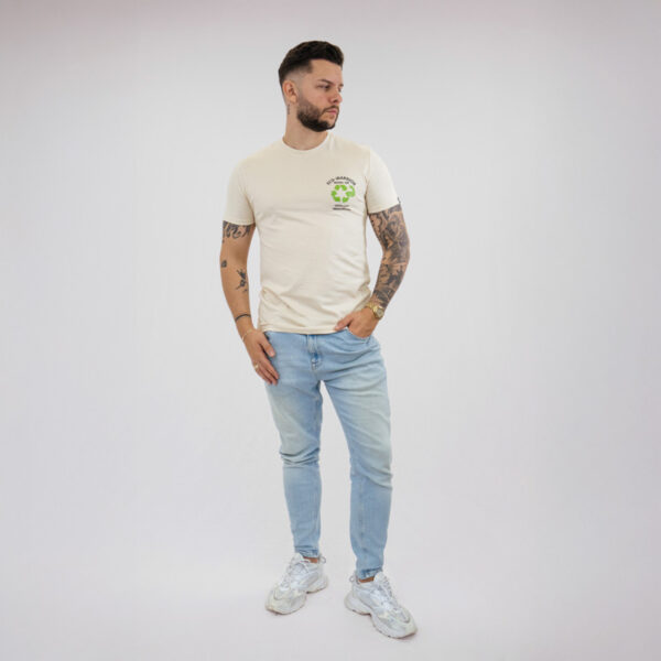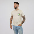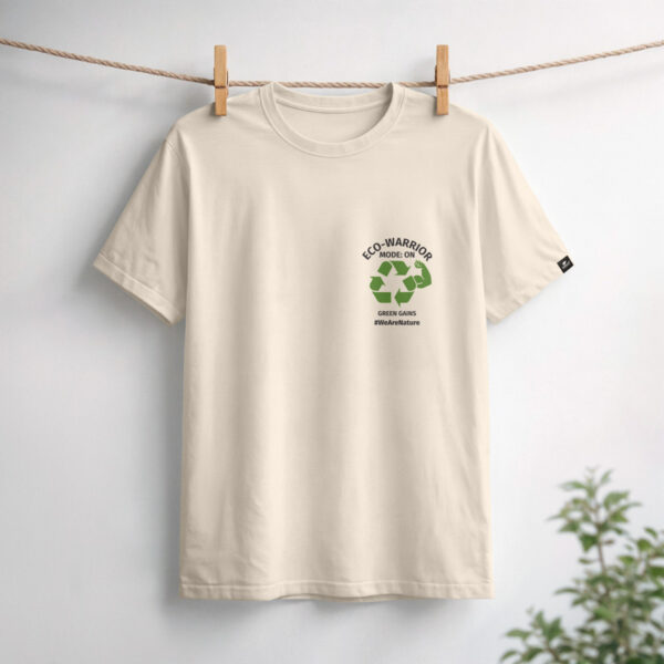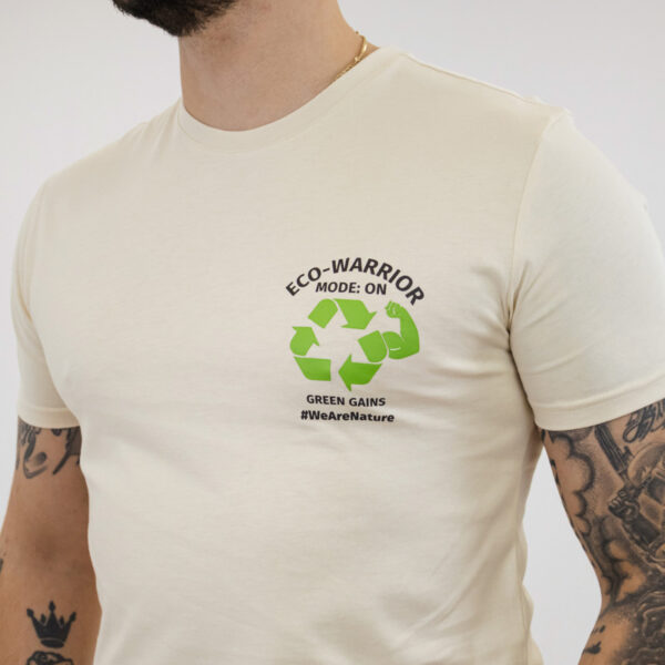Un T-shirt beige affichant le texte audacieux « ECO-WARRIOR MODE: ON » et « GREEN GAINS », avec une illustration ludique d’un symbole écolo vert en train de montrer ses muscles. Ce tee-shirt est une façon amusante et motivante d’afficher votre engagement envers la durabilité et la force.