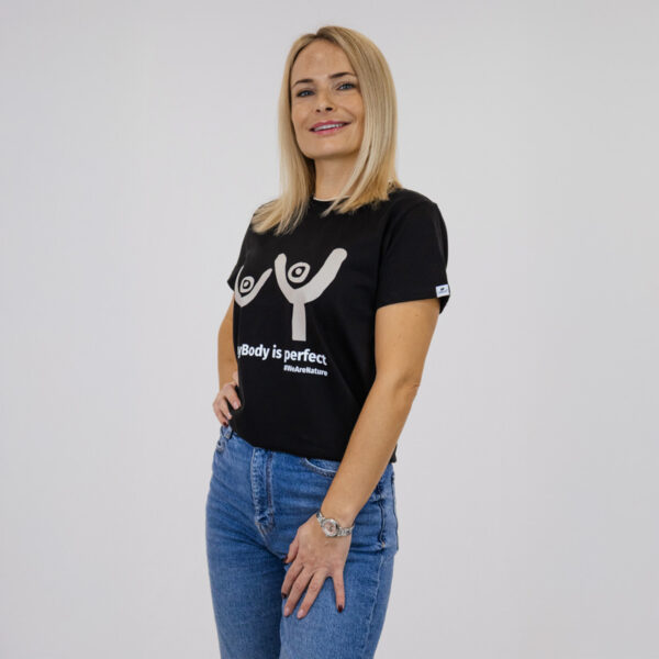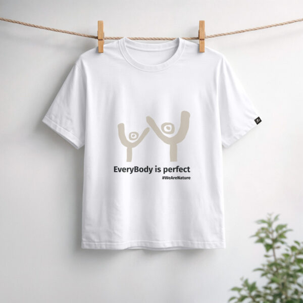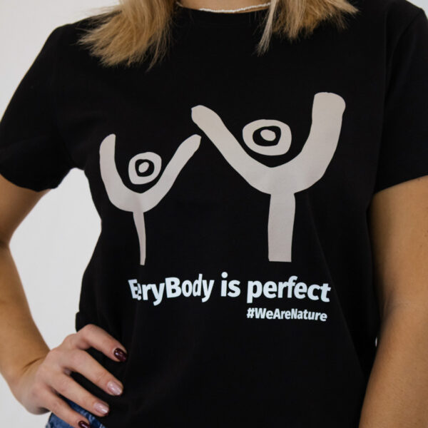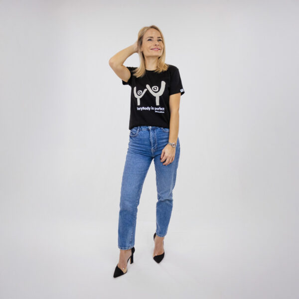 Un T-shirt noir minimaliste créé pour une confiance au quotidien sans effort. Orné d’un graphisme simple et abstrait représentant deux silhouettes joyeuses avec le message « EveryBody is perfect » dans un imprimé neutre et doux, il célèbre l’authenticité, l’inclusivité et l’amour de soi.