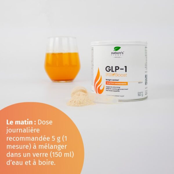 GLP-1 ProBoost: Dose quotidienne recommandée : 5 g (1 dose) à mélanger dans un verre (150 ml) d’eau et à boire. Pour un dosage précis, nous vous conseillons de peser la quantité.
