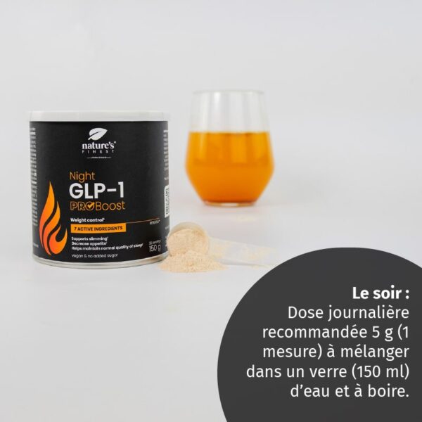 Night GLP-1 ProBoost: Dose quotidienne recommandée : 5 g (1 dose) à mélanger dans un verre (150 ml) d’eau et à boire. Pour un dosage précis, nous vous conseillons de peser la quantité.