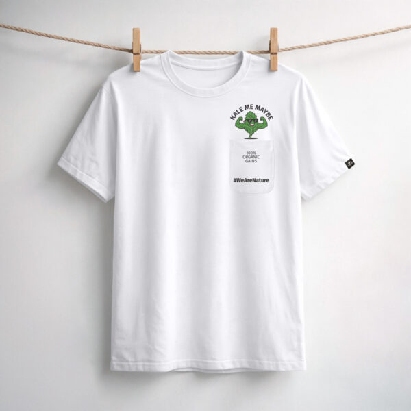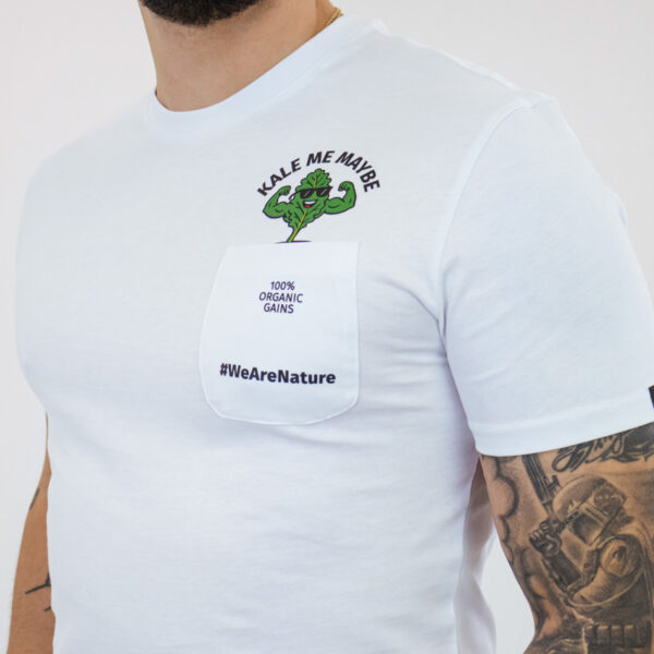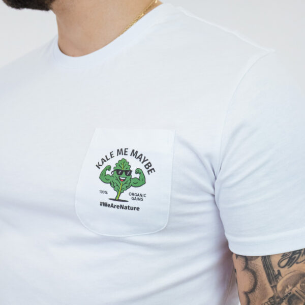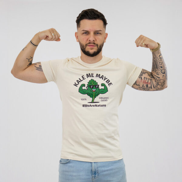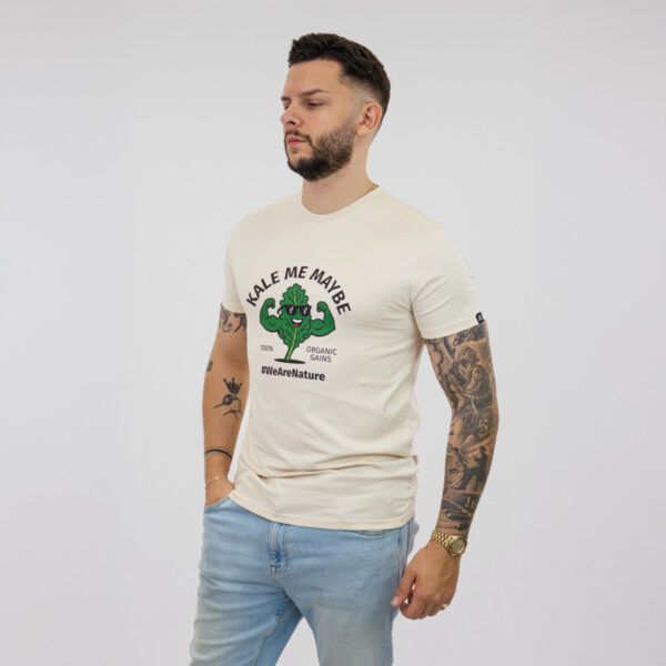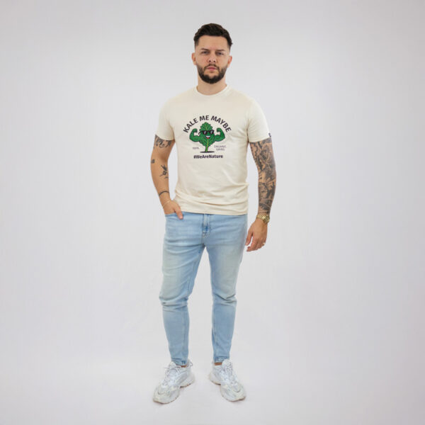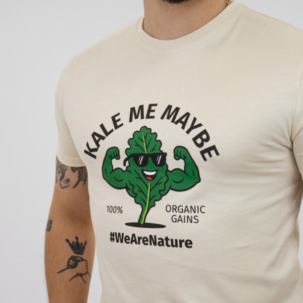 Un t-shirt beige minimaliste qui allie un style sans effort à une sensation décontractée. Orné de la phrase ludique « Kale Me Maybe » et d’un graphisme amusant, il apporte une touche décontractée et affirmée à n’importe quelle tenue.