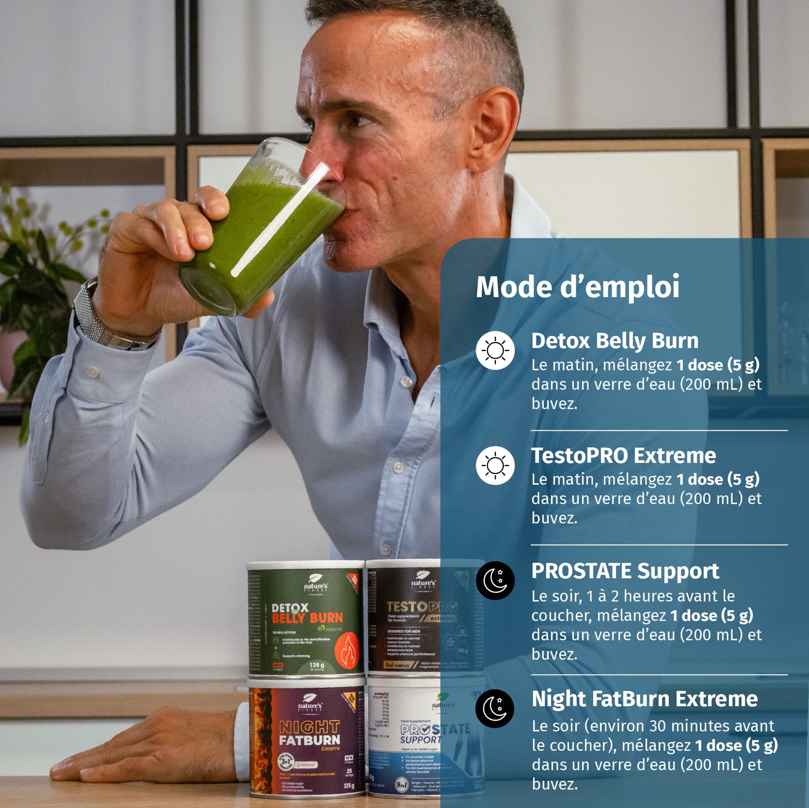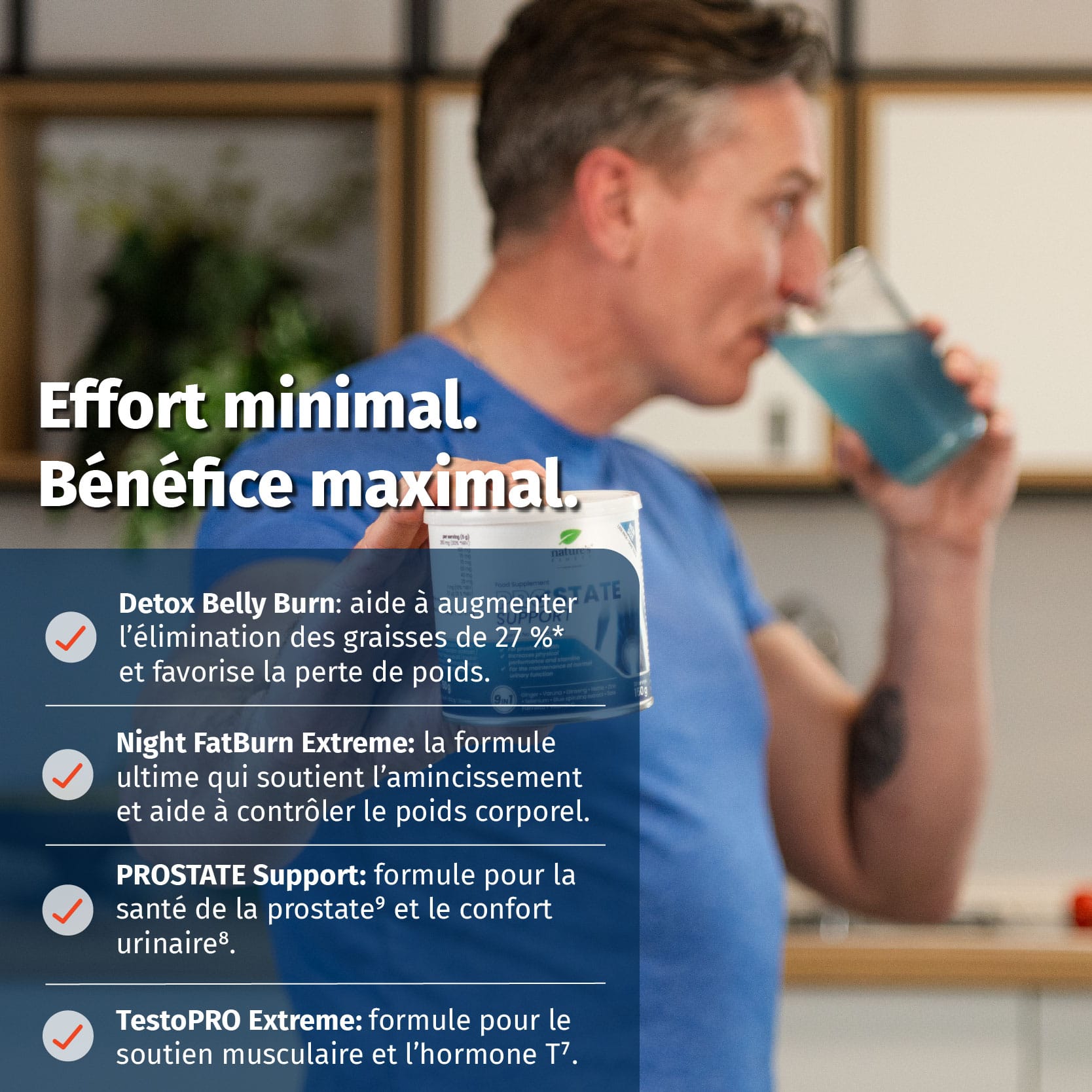 Le pack ultime de transformation pour hommes : augmente l’élimination des graisses⁵, aide à maintenir une endurance optimale⁷ et soutient le fonctionnement normal de la prostate⁸