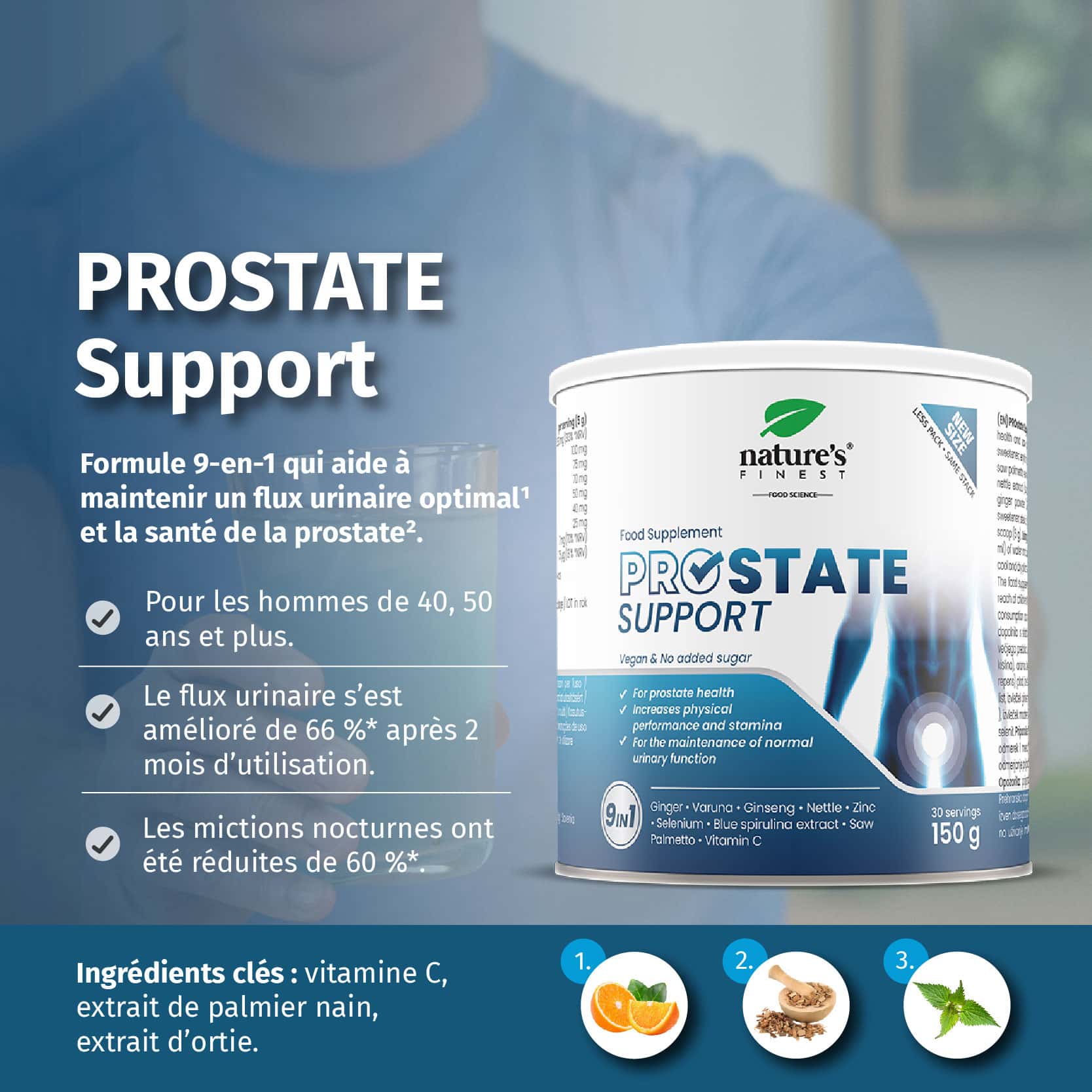 • PROSTATE Support : une formule pour la santé de la prostate⁹ et le confort urinaire⁸ – après deux mois d’utilisation, les utilisateurs rapportent une amélioration du flux urinaire de 66 %*. Avec du palmier nain pour le fonctionnement normal de la prostate et de la fonction urinaire chez les hommes de plus de 45 ans.