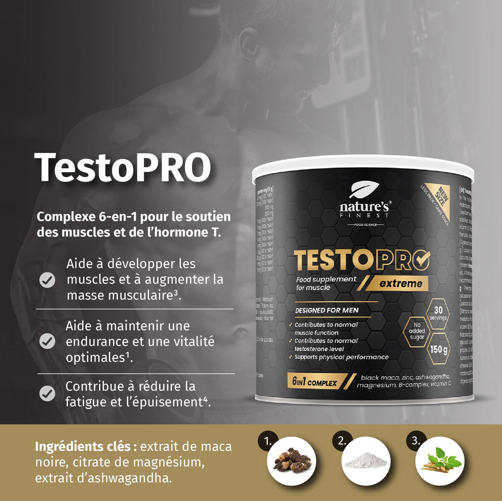 • TestoPRO Extreme : une formule pour le soutien musculaire et l’hormone T⁷ – contribue à un niveau normal de l’hormone T dans le sang⁶, le magnésium contribue à réduire la fatigue et l’épuisement ainsi qu’au fonctionnement normal des muscles.