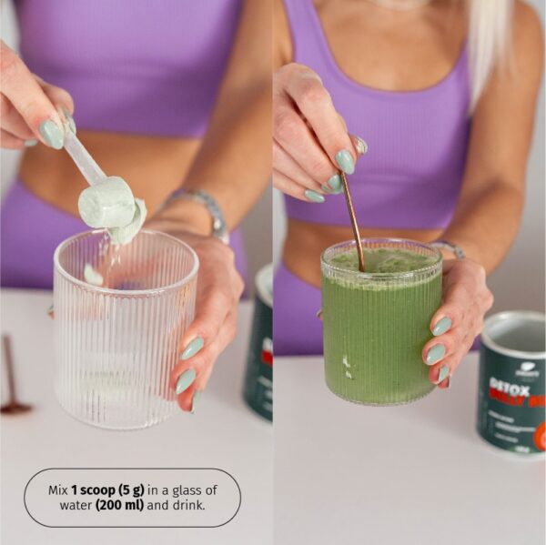 Detox Belly Burn: Mélangez 1 dose (5 g) de préparation dans un verre d’eau (200 ml) et buvez.