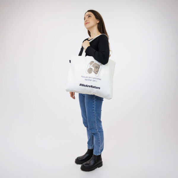 Un sac cabas intemporel conçu pour un style sans effort et un usage quotidien. Imprimé du message inspirant « La nature n’est pas parfaite. Moi non plus. » accompagné d’un dessin linéaire minimaliste d’un visage serein, il célèbre l’authenticité et l’acceptation de la beauté naturelle.