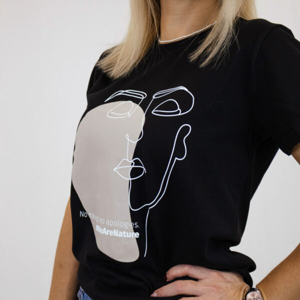 Un T-shirt noir minimaliste avec une touche artistique audacieuse mais raffinée. Orné d’un visage abstrait en line-art associé à une forme douce et neutre, ainsi que du message « Sans maquillage, sans excuses. », il célèbre la beauté naturelle et une confiance assumée.