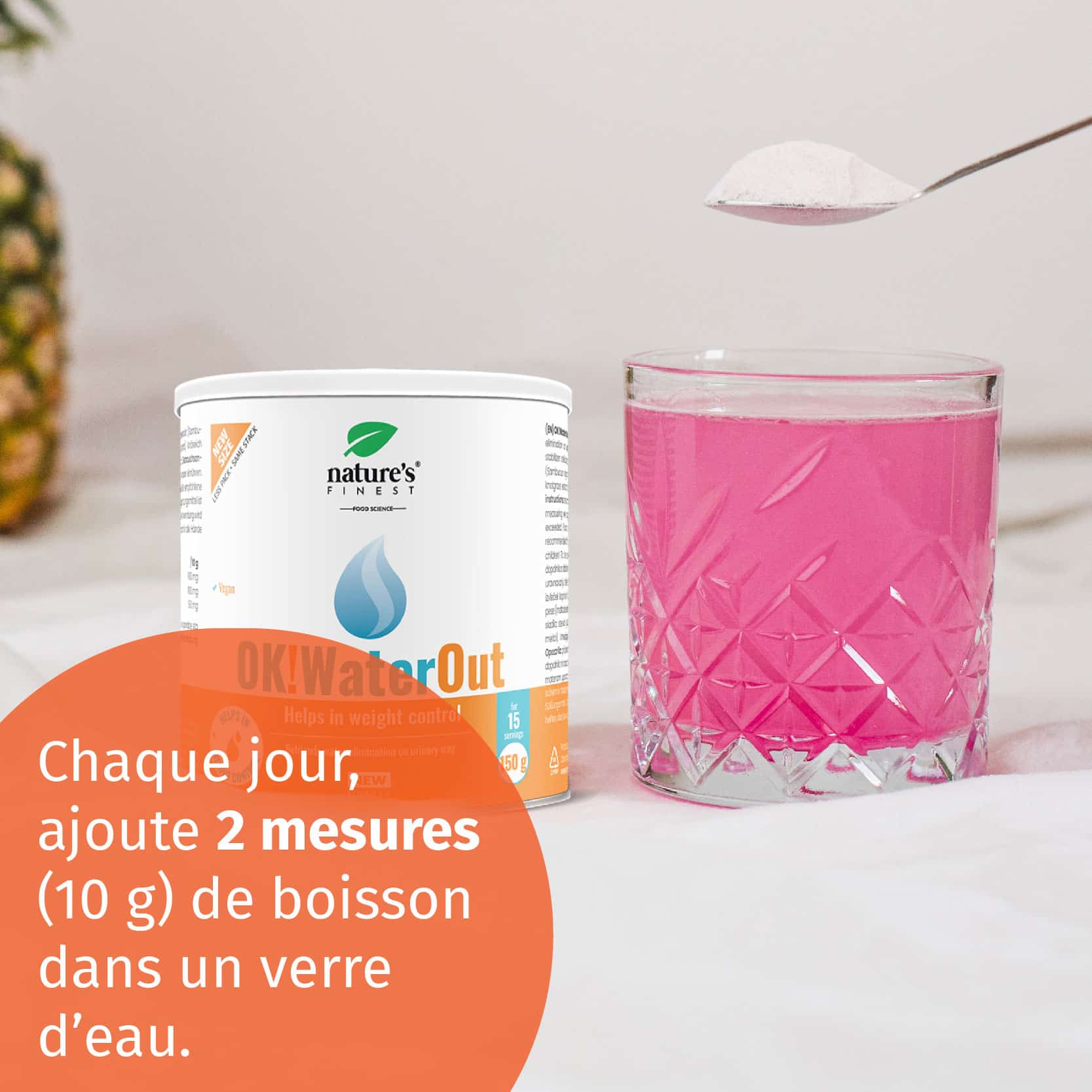 Chaque jour, dosez 2 mesures (10 g) de boisson OK!WaterOut dans un verre d’eau. Avec une mesure, vous consommerez 100 mg d’extrait d’ortie, 100 mg d’extrait de sureau et 50 mg de renouée.