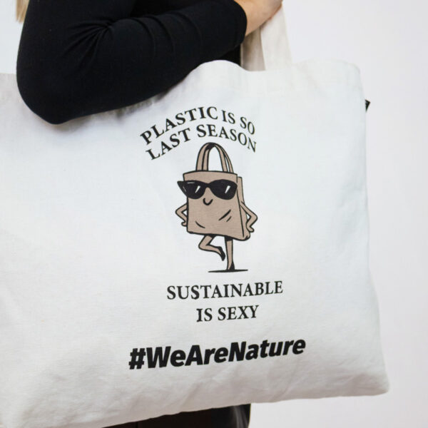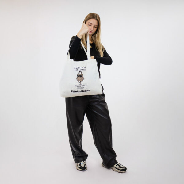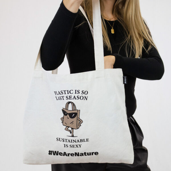 Un tote bag intemporel conçu pour un style quotidien avec une touche durable. Imprimé du message espiègle « Le plastique, c’est tellement la saison dernière. Le durable, c’est sexy. » et d’une charmante illustration d’un sac de courses sûr de lui portant des lunettes de soleil, il apporte humour et caractère à un mode de vie responsable.