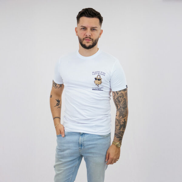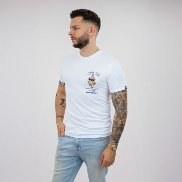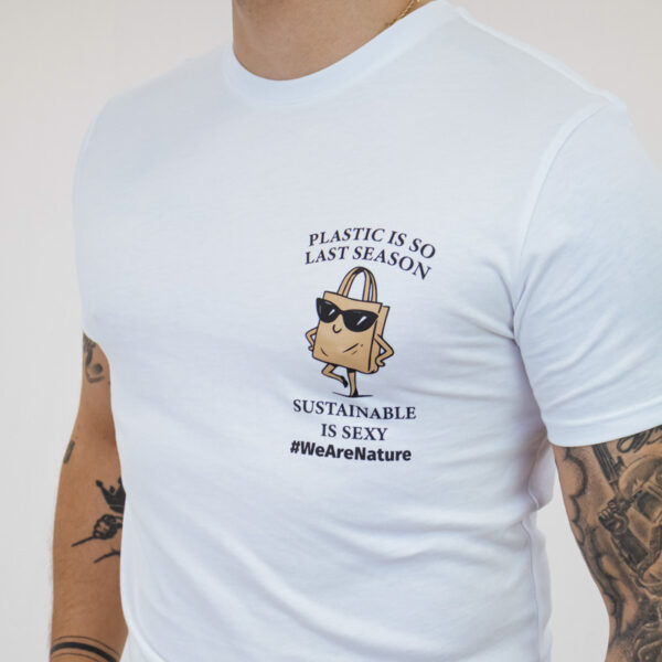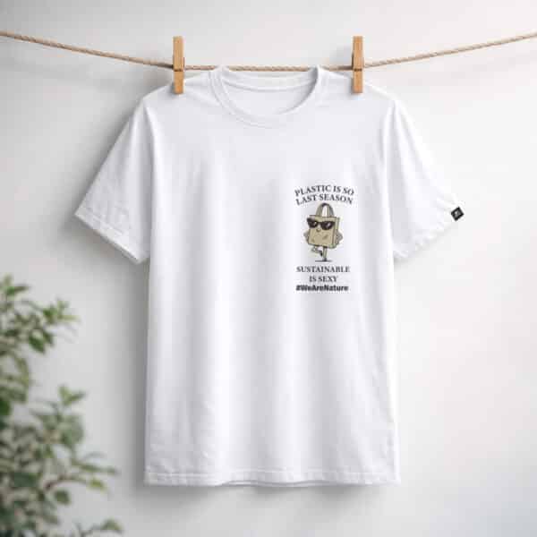 Un T-shirt blanc minimaliste qui allie style et intention. Orné de l’affirmation audacieuse « Le plastique, c’est tellement la saison dernière. Le durable, c’est sexy. » dans un visuel accrocheur, il apporte une touche assurée et ludique à n’importe quelle tenue.