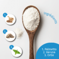 Ingrédients : maltodextrine, édulcorant : érythritol, vitamine C (acide ascorbique), arôme de myrtille, stabilisant : cellulose, extrait de palmier (Serenoa repens), extrait d’écorce de varuna (Crataeva nurvala), extrait de feuilles d’ortie (Urtica dioica), extrait de ginseng (Panax ginseng), gluconate de zinc, gingembre en poudre (Zingiber officinale), extrait de spiruline bleue (Arthrospira platensis), édulcorant : glycoside de stéviol, sélénite de sodium.