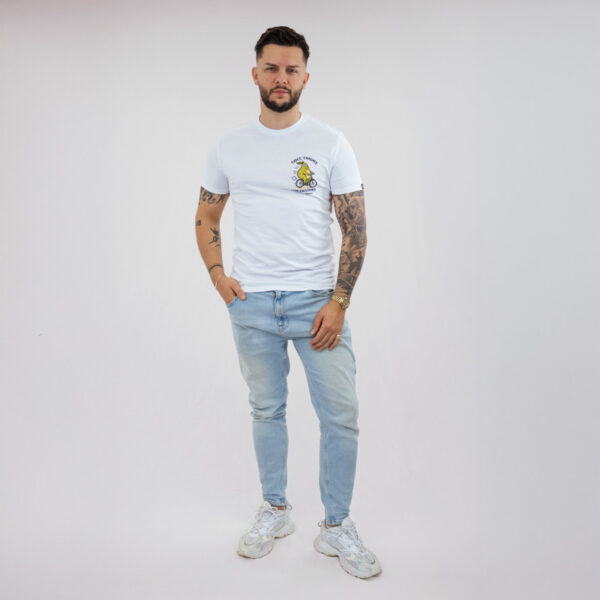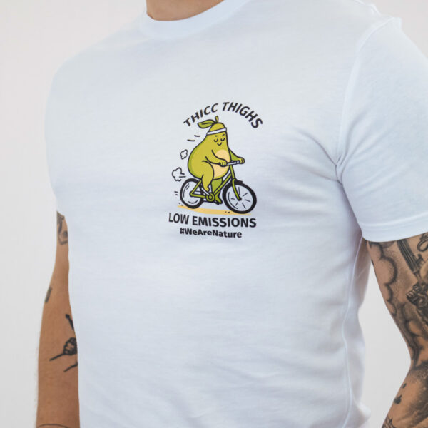 Un t-shirt blanc conçu pour un style quotidien sans effort. Arborant le message « Thicc thighs, low emissions » avec un graphisme ludique d’un avocat à vélo, il célèbre la confiance en soi, l’amour de soi et le fait de vivre avec intention.